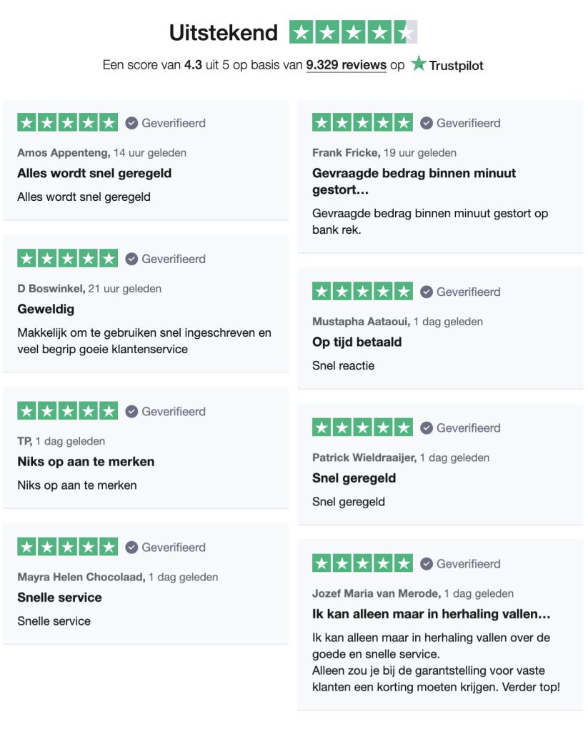 | €1100 | €17,98 | €1117,98 | 13,61% | 62 dagen | Aanvragen |