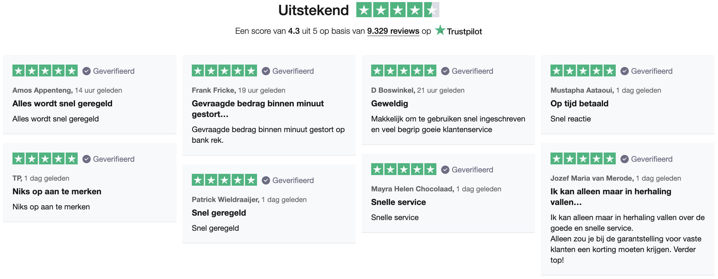 Goede service als altijd, snel, duidelijk, prima voorwaarden. Absolute aanrader als het eind van de maand wat langer duurt.
